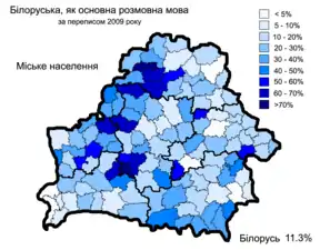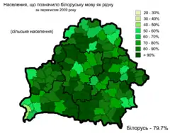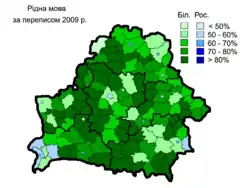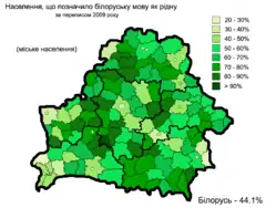 - Частка населення, яке вказало, що спілкується білоруською мовою вдома за переписом 2009 року