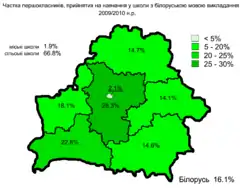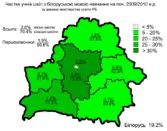 У 2007—2008 роках білоруською мовою навчалися 195,6 тис. учнів (18,4 % від загальної кількости), з них 14,7 тис. першокласників (16,7 %). Більшість білоруськомовних шкіл розташовані в сільській місцевості[27].