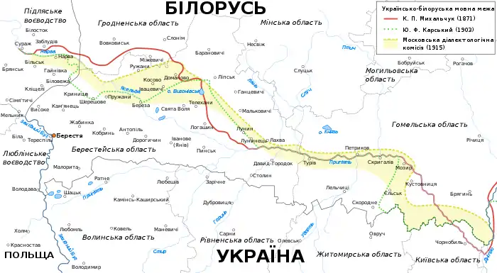 Діалектологічна мапа української мови, 1871 рік. Видно південну межу білоруської мови