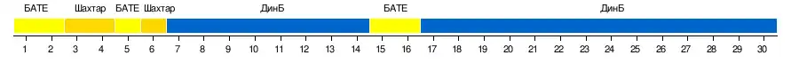 | Мінськ | 3-2 | 1-2 | 0-0 | 0-0 | 1-6 | 0-3 | 3-2 | 3-3 | –––– | 2-1 | 1-0 | 1-0 | 1-0 | 2-0 | 3-0 | 0-0 |