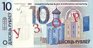 10 рублів | 139×72 | блакитний | Вітебська область | Спасо-Преображенська церква, Полоцьк, Вітебська область | колаж на тему просвітництва і книгодрукування: книги, знак Франциска Скорини, хрест Єфросинії Полоцької. |