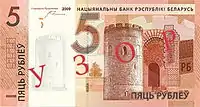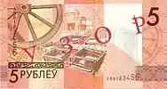 5 рублів | 135×72 | помаранчево-червоний | Берестейська область | Кам'янецька вежа, Кам'янець, Берестейська область | колаж на тему перших слов'янських поселень: фрагмент шкіряного пояса, дерев'яне колесо, зображення дитинця «Берестя». |
