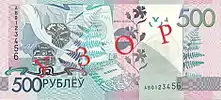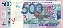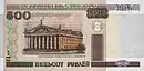 500 рублів | 150 x 74 мм | Коричневий | Республіканський палац культури профспілок у Мінську | Скульптури на фронтоні будівлі | |||