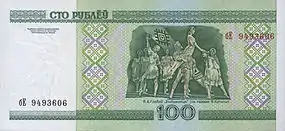 100 рублів | Зелений | Національний академічний Великий театр опери та балету Республіки Білорусь | Сцена із балету «Обраниця» | 1 січня 2017 | |||