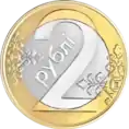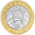 2 рублі | 23,5 | 2 | 5,81 | нікелево-латунне кільце і центральна частина зі сталі з нікелевим покриттям | викарбувані букви | герб Республіки Білорусь, напис «Беларусь» і рік виготовлення по колу, розділені орнаментом «Багач» |