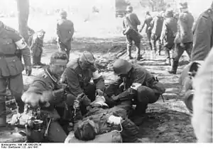 ![]() Радянські військовополонені розчищають завали на дорогах Мінська. Літо 1941 | |||||||