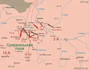 На південь діяла німецька 9-а армія (командувач — генерал-полковник А. Штраус), що атакувала з фронту радянську 3-ю армію (командувач — генерал-лейтенант В. І. Кузнецов), відкинула її і на наступний день зайняла Гродно. Контратака радянського 11-го механізованого корпусу під Гродно в перший день війни була відбита.