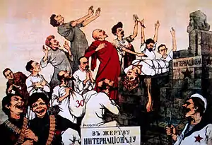 | Росія — найбільш дрібнобуржуазна країна з усіх європейських країн. Гігантська дрібнобуржуазна хвиля захлеснула все, придушила свідомий пролетаріат не тільки своєю чисельністю, а й ідейно, тобто заразила, захопила дуже широкі кола робітників дрібнобуржуазними поглядами на політику.[22] |