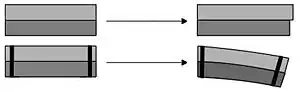 де α1 коефіцієнт теплового розширення першого матеріалу і α2 коефіцієнт теплового розширення другого матеріалу. ΔT приріст температури відносно початкової, при якій балка не має вигину.[3][4]