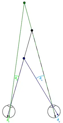 На зображенні: Чорна заповнена точка це точка фіксації. Синій об'єкт знаходиться ближче до споглядача. Таким чином, він має «ближню» диспаратність dn. Об'єкт, який знаходиться далі (зелений) відповідно має «дальню» диспаратність df. Бінокулярна диспаратність це кут між двома лініями проєкції в одному оці (математично, dn-df, із знаком, виміряно проти годинникової стрілки). Одна з них є справжньою проєкцією від об'єкта на справжню точку проєкції. Інша є уявною проєкцією, яка проходить через вузлові точки точки фіксації.