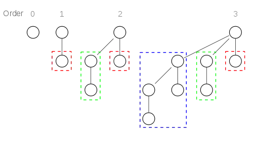 Купи складається з біноміальних дерев ступенів 0, 2 і 3.
