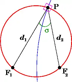 де σ-координата точки P дорівнює куту F1 P F2, а τ-координата дорівнює натуральному логарифмові відношення відстаней d1 та d2 до фокусів