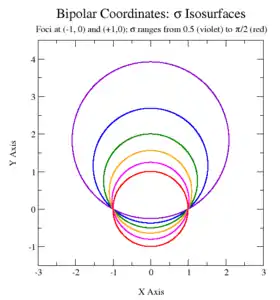 що перетинаються в двох фокусах. Центри кіл сталих σ лежать на осі ігреків. Позитивні σ дають кола з центрами над віссю x, а негативні — нижче ві неї. Зі зростанням значення |σ| , радіус кола зменшується, а його центр наближається до початку координат (0, 0), досягаючи його при |σ| = π/2, що є максимальним значенням змінної.