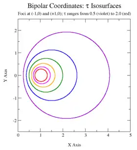 Вони оточують фокуси, та не є концентричними. Центри кіл сталих τ лежать на осі іксів. Кола з дотатними τ лежать праворуч осі ігриків (x > 0), а кола з від'ємними τ лежать зліва від осі ігриків (x < 0). Крива τ = 0 відповідає осі ігриків (x = 0). Зі збільшенням абсолютньї величини τ радіус кіл зменшується, а їхні центри стягуються до фокусів.