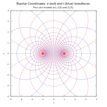 Біполярна система координат — ортогональна система координат на площині на основі кіл Аполлонія[1]. Криві, що відповідають сталим значенням змінних σ і τ перетинаються під прямими кутами. Координати задаються двома фокусами F1 та F2, зазвичай у точках (−a, 0) та (a, 0), відповідно, на осі іксів декартової системи координат.