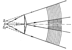 Біпризмою також користуються для розділення світла, джерелом якого є щілина, паралельна ребру біпризми (див. ілюстрацію), на два когерентні; внаслідок взаємодії пучків, що нібито виходять із точок S1 і S2, виникає інтерференція світла.