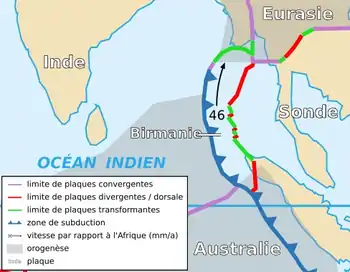 Індостанська плита дрейфує на північ відносно швидко (приблизно 16 см/рік). а також обертається проти годинникової стрілки. В результаті цього руху і обертання, конвергенція вздовж східної межі (Бірмо-Андамано-Малайський регіон) плити з Євразією йшлося по косому куту.