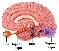 ![]() Бічне колінчасте ядро (ЛКЯ) є проміжним центром для передачі зорової інформації від очей до кіркових структур. | |