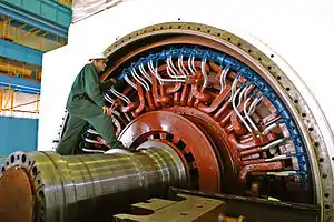 Трифазні синхронні турбогенератори ТВВ-1000 призначені для вироблення електроенергії при безпосередньому з'єднанні з паровими турбінами. Активна потужність — 1000 МВт, напруга 24 кВ, частота обертання ротора 1500 (3000) об/хв. Генератор являє собою трифазну неявнополюсну електричну машину, що складається з нерухомої частини (статора), яка містить у собі сердечник і обмотку й під'єднується до зовнішньої мережі, і рухомої частини (ротора), на якій розташована обмотка збудження, що живиться постійним струмом. Механічна енергія, що передається від валу турбіни на вал ротора генератора, перетворюється в електричну електромагнітним шляхом: в обмотці ротора під дією електричного струму створюється магнітний потік, який, перетинаючи обмотку статора, наводить у ній ЕРС. Генератор складається із статора, торцевих щитів, ротора, виводів з нульовими трансформаторами струму і гнучкими перемичками, газоохолоджувача, опорного підшипника ущільнення валу і фундаментних плит. Збудження генератора здійснюється від безщіткового збудника типу БВД-1500, що складається з синхронного генератора та обертового випрямляча. Роботу генератора забезпечують безліч допоміжних систем. До кожного турбогенератора через генераторні вимикачі підключається два підвищувальні трифазні трансформатори потужністю по 630 МВ•А кожен, які, з'єднані паралельно і дозволяють видавати номінальну потужність блоку в мережу[3].
