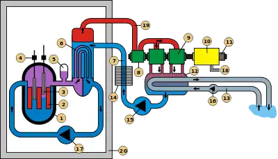 Перший контур реактора, повністю ізольований від другого, що зменшує радіоактивні викиди в атмосферу. Циркуляційні насоси прокачують воду через реактор і теплообмінник (живлення циркуляційних насосів походить від турбіни). Вода реакторного контуру перебуває під високим тиском, тому незважаючи на її високу температуру (320 градуси за Цельсієм — на виході, 289 — на вході в реактор) її закипання не відбувається.