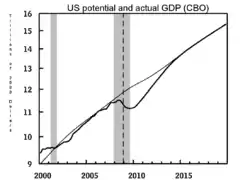 Потенційний (тонка лінія) і фактичний ВВП за оцінкою бюджетного комітету Конгресу США. Різниця — розрив ВВП