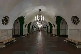 Склепіння просторого залу станції підтримують 18 потужних пілонів, оздоблених білим з сірими прожилками мармуром. Скошені грані пілонів пофарбовані в зелений колір. Спочатку на них планувалося розмістити мозаїчні панно, проте в часи боротьби з надмірностями, коли станція будувалася, цей проект було скасовано. На пілонах розташовані вентиляційні отвори з литими ґратами. Підлога викладена сірим і червоним гранітом. Зал освітлюється люстрами з подвійними плафонами з прозорого кришталю.