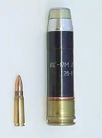 ![]() 30-мм гранатометна граната ВОГ-17, використовувана в радянських 30-мм автоматичних гранатометах. Зліва для порівняння проміжний патрон 7,62x39 мм | |