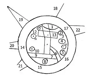 ![]() | 1. "гора" (аккад. šá-du-ú) 2. "місто" (аккад. uru) 3. Урарту (аккад. ú-ra-áš-tu) 4. Ассирія (аккад. kuraš+šurki) 5. Der (аккад. dēr) 6. ? 7. болото (аккад. ap-pa-ru) 8. Елам (аккад. šuša) 9. канал (аккад. bit-qu) 10. Bit Yakin (аккад. bῑt-ia-᾿-ki-nu) | 11. "місто" (аккад. uru) 12. Habban (аккад. ha-ab-ban) 13. Вавилон (аккад. tin.tirki), розділяється Євфратом на дві частини 14 — 17. Океан (солона вода, аккад. idmar-ra-tum) 18 — 22. Міфологічні об"єкти 23 — 25. Непідписані об"єкти |