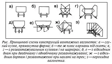 Розрізняють такі основні вантажні вагонетки: з глухим неперекидним та перекидним кузовом, з відкидним дном та з відкидним бортом.