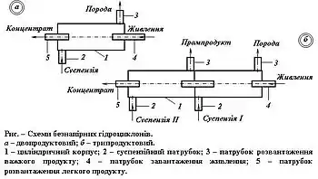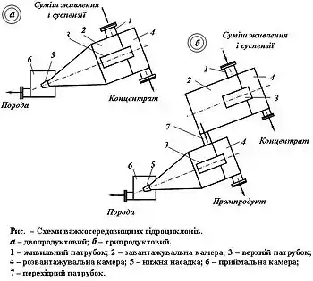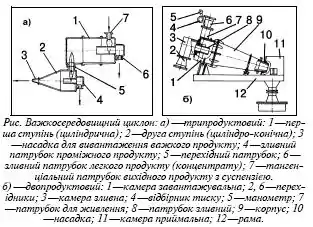 Трипродуктовий важкосередовищний гідроциклон (рис. б) дозволяє в єдиному потоці суспензії розділити матеріал на три продукти. Він являє собою апарат, що складається з циліндричної і циліндроконічної секцій, з'єднаних між собою перехідним патрубком 7.