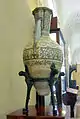 Тулово вази має чотири смуги декору, орнамент котрих не повторюється. Використані світло-коричневі фарби на світлому тлі кемачного виробу. Смуги мають орнаменти і смуги написів (найнижчий - смуга орнаменту, вищий за нижній має куфічний напис). Третій від низу має круглі медальйони з куфічними літерами. Крила вази прикрашені зображеннями алебард, котрі вінчають зображення людських долонь. Горло вази має вертикальні рельєфні смуги, проміжки між якими прикрашені вертикальними ж орнаментами. Монохромність декору ніде не порушена введенням яскравих фарб.
