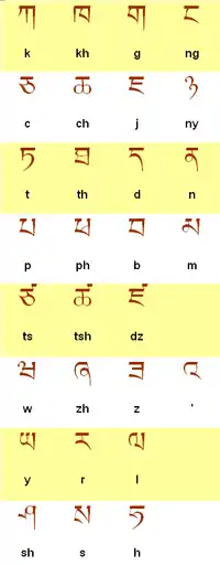 | ཙ | tsa | [tsá] | ཚ | tsha | [tsʰá] | ཛ | dza | [dzà/tsʰà] | ཝ | wa | [wà] |