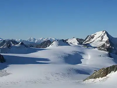 Брандербурґер-Гаус (праворуч на передньому плані) та Вайскуґель (праворуч на задньому плані), сфотографовані з Флюхткоґеля. Удалині — Кенігшпітце, Монте Дзебру та Ортлер
