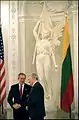 Адамкус потиснув руку Джорджу Вокеру Бушу в президентському палаці у Вільнюсі. На задньому фоні копія відомої скульптури Юозаса Зікараса - Статуя Свободи