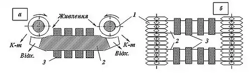 1 – валки; 2 – магнітопровід; 3 – обмотки електромагніту.