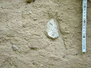 Колір бурий та сірий. Шаруватість відсутня. Іноді тонко-пластинчаста горизонтальна окремість (внаслідок тиску льодовика).