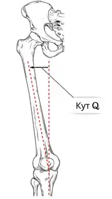 Ступінь genu valgum клінічно можна оцінити за кутом Q, який являє собою кут, утворений лінією, проведеною від передньої верхньої клубової ості через центр надколінка та лінією, проведеною від центру надколінка до центру великогомілкової кістки. У жінок кут Q повинен бути менше 22 градусів при розгинанні коліна і менше 9 градусів при згинанні коліна на 90 градусів. У чоловіків кут Q повинен бути менше 18 градусів при розгинанні коліна і менше 8 градусів при згинанні коліна на 90 градусів. Типовий кут Q становить 12 градусів для чоловіків і 17 градусів для жінок[5]