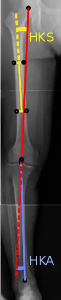 На проекційній радіографії, ступінь варусної або вальгусної деформації може бути визначена кількісно за допомогою кута стегна до коліна-щиколотки[6], який представляє собою кут між механічної віссю стегна та центром гомілковостопного суглоба[7]. Зазвичай він становить від 1,0 ° до 1,5 ° вальгусної деформації у дорослих[8]. Нормальний діапазон у дітей різний[9].