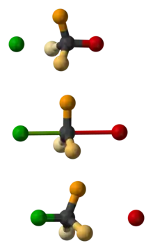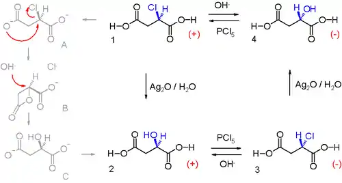 Наявність такої інверсії під час хімічного перетворення іноді вказують у хімічному рівнянні за допомогою стрілковидного символу від реактантів до продуктів, вказаного на поданій тут схемі.