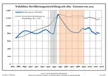 Динаміка населення з 1875 року в сучасних кордонах (Синя лінія: населення; Пунктир: відносна порівняльна динаміка населення землі Бранденбург; Сірий фон: період Третього рейху; Помаранчевий фон: період НДР)