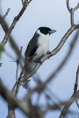 Тіло сягає 24 см завдовжки. Голова та крила чорного кольору. Спина, горло та черево білого забарвлення. Хвіст широкий, сіро-коричневого забарвлення. Яскравий блакитний дзьоб — тонкий, призначений для полювання на комах.