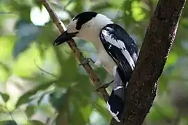 Птах середнього розміру, завдовжки 25–29 см заввишки і вагою 53–81 г важкий. Птах з білою головою та чорною шапкою, міцним чорним дзьобом з характерним гачком на кінчику та білими смугами на чорних крила. Груди і живіт чорні, хвіст сірий з широкою чорною смугою і білим кінчиком.