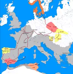 Восени 409 року вандали в союзі з аланами і свевами вторглися до Римської Іспанії (сучасний Піренейський півострів), пройшовши через Галлію (сучасну Францію)[3]. Там вони отримали землю від римлян, як федерати, в провінціях Галісія (на північному заході) і Бетіка (південь). Алани отримали землі в Лузитанії (на заході) і регіон навколо міста Картаго Нова (зараз Картахена). Свеви також отримали частину Галісії. Вестготи, які перед тим як одержати земелі у Септіманії (регіон в південній Франції) вторглись до Іберії, та 426 році розгромили аланів, серед загиблих був і король західних аланів Атакес (Attaces). Залишок аланів згодом звернувся до короля вандалів Гундеріка аби той прийняв корону аланів. Пізніше королі вандалів в Північній Африці називали себе королями вандалів та аланів (лат. Rex Wandalorum et Alanorum).
