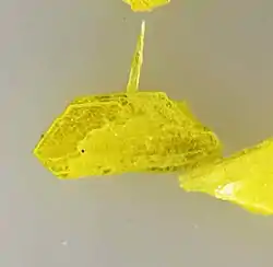 Сингонія ромбічна. Утворює нальоти і кірочки, інколи дрібні псевдогексагональні кристали. Спайність досконала. Густина 3,64. Твердість 2. Колір жовтий. Вторинний мінерал зони окиснення.