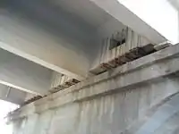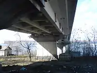 - 65,4 м — складається з 4-х попередньо напружених залізобетонних балок. Висота на опорі — 3,4 м, у прольоті — 3,25 м. Товщина плити — 18 см. Витрата бетону М450 становить 0,65 м³/м², арматури 84 кг/м² (в тому числі високоміцного дроту 54,5 кг/м²).