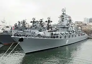 | Зенітне озброєння | 8×8 ПУ ЗРК С-300Ф «Форт», 2×2 ПУ ЗРК 4К33 «Оса-МА», 6×6 30-мм ЗАК АК-630 | |