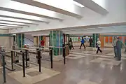 Біля сходів у вестибюлі розміщені ліфти для інвалідів, шахти ліфтів — з тонованого скла та алюмінію.