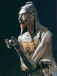 Має вигляд аскета-старця, який однією рукою спирається на тростину, а іншою тримає сувій, символ «Сутри Серця». Виступає охоронцем цієї сутри, тому часто з'являється на картинах 18 добрих божеств.