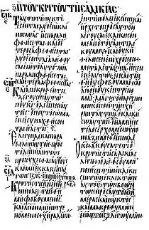 Текст на аркуші розташований у дві колонки, 27 лінії в колонці. Грецькі унціали схожі на слов'янські літери (кирилицю).