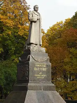 Після закінчення війни Хрущов розпорядився встановити Ватутіну пам'ятник з написом «генералові Ватутіну від українського народу». Таким написом Хрущов, нібито, хотів іронічно допекти націоналістам, однак у Москві сприйняли цю іронію в протилежному ключі, і тому Хрущов був змушений тлумачити свої мотиви особисто Сталіну та отримав згоду на цей напис[9].
